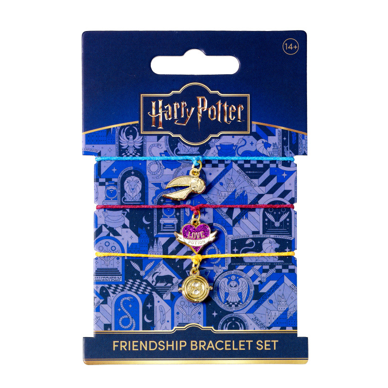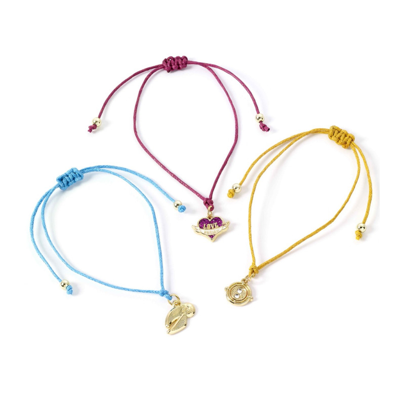 A collectable friendship bracelet set featuring the classic charms of Golden Snitch, Love Potion & Time Turner charm on a nylon cords. Wear them layered and swop with friends.