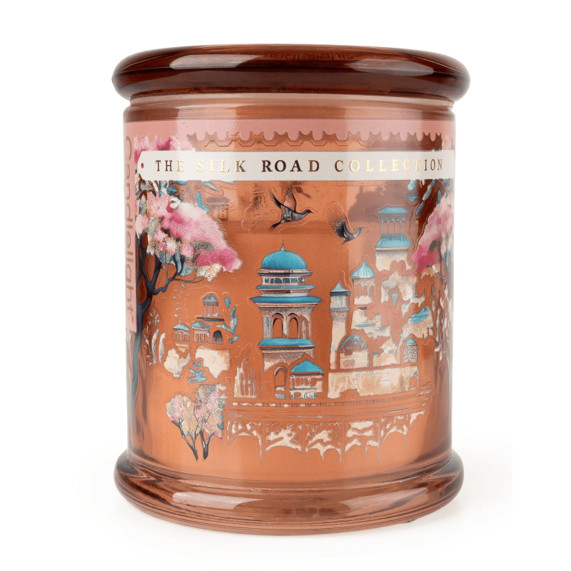 A rich terracotta hue sets the scene for jewel-toned domes, blossom trees and soaring birds, all finished with a chic “The Silk Road Collection” gold accent.