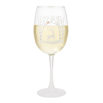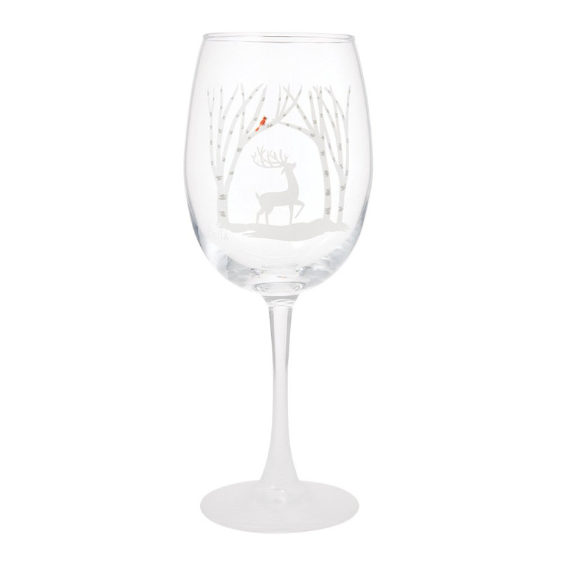 Featuring a silhouetted stag trotting through the snow, a red cardinal warms the white winter scene and your new favourite winter glass.