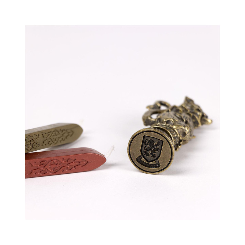 Simply light the wick. Let it burns for a few seconds, then let the molten wax drip onto your document. Take the stamp and press into the wet wax to create a seal with the shield design. The wax then hardens and your document is sealed