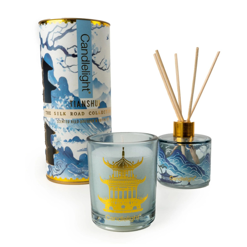 Journey to sun-drenched Jhangye with this elegant Gift Set from The Silk Road Collection, featuring a scented reed diffuser and coordinating votive candle.